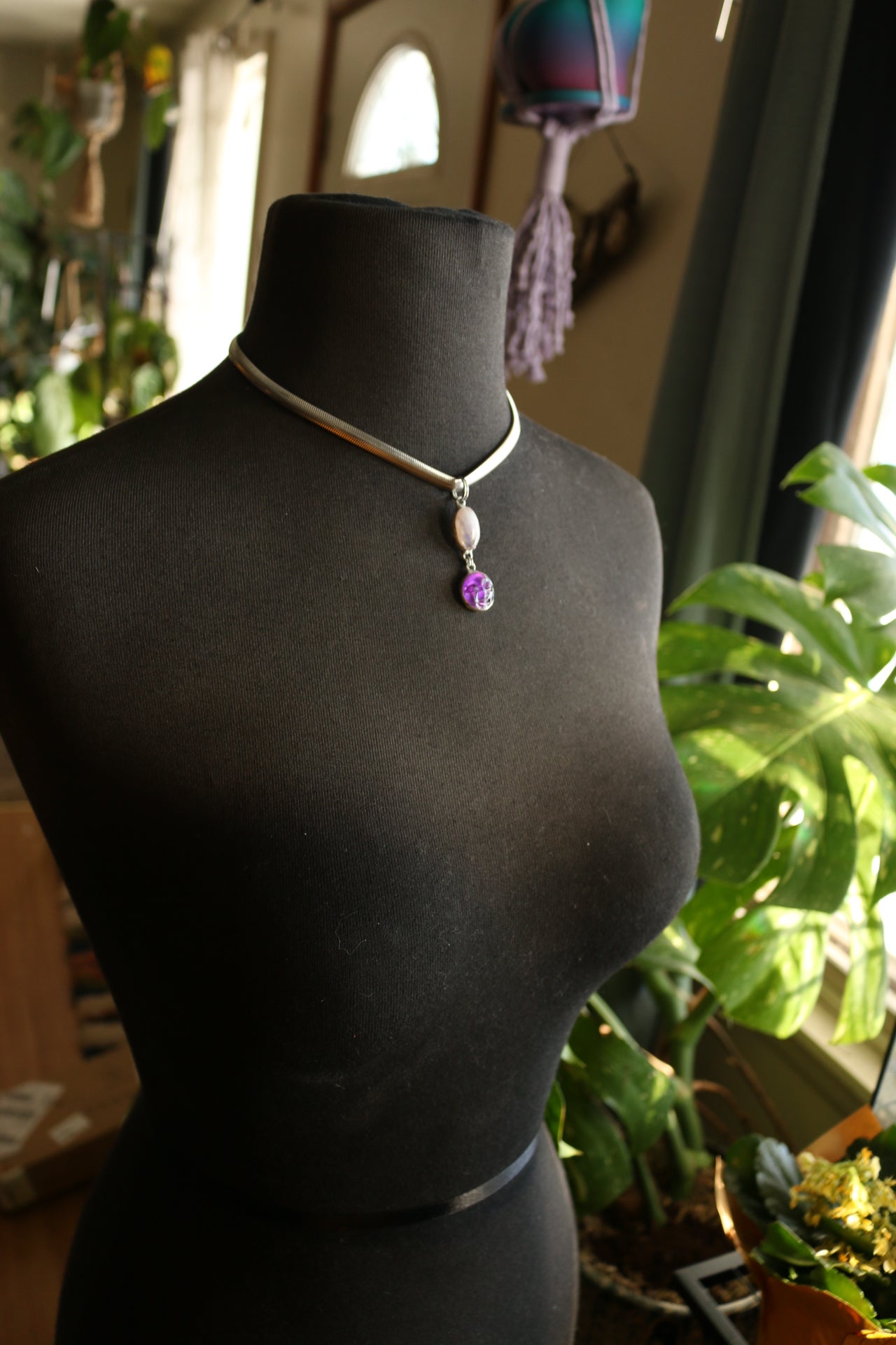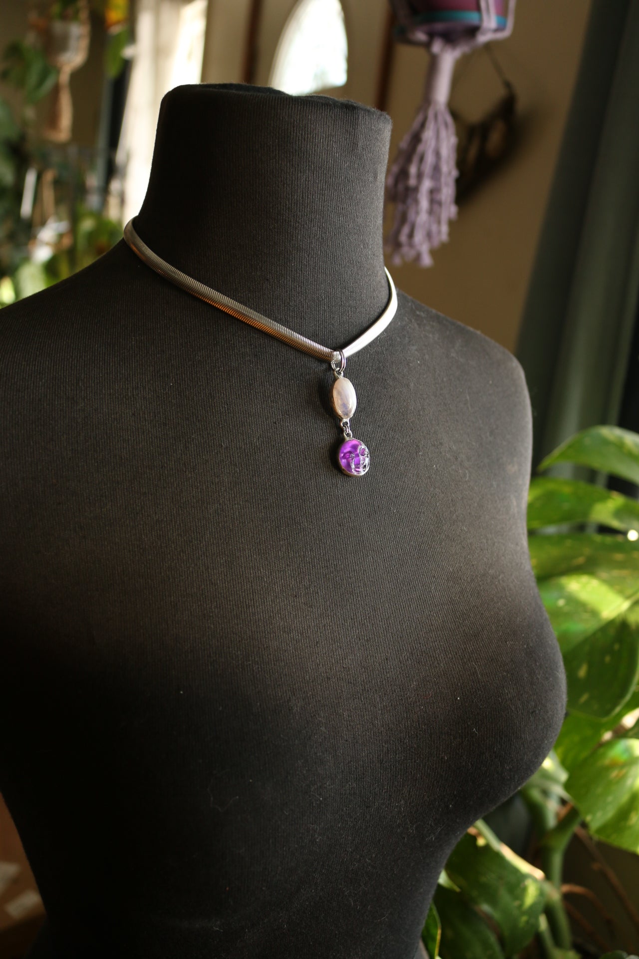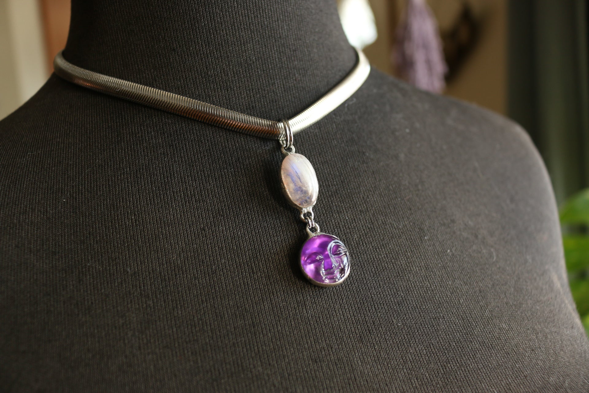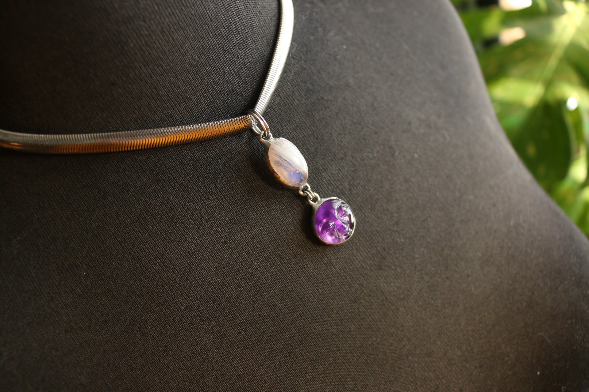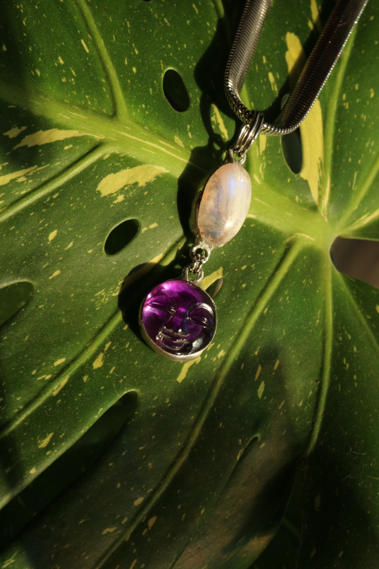Stone Type: Rainbow Moonstone and Amethyst-Mother of Pearl Doublet