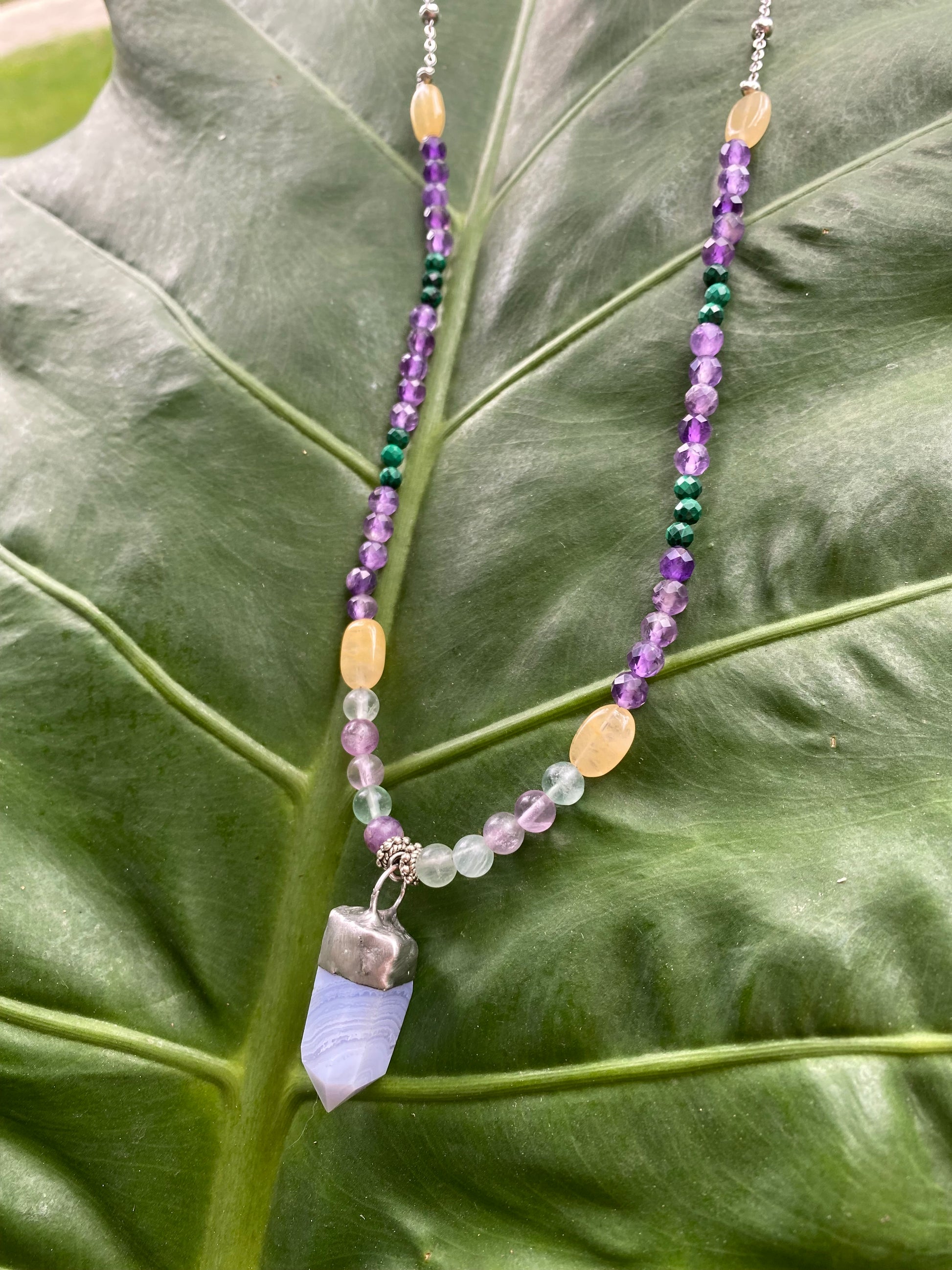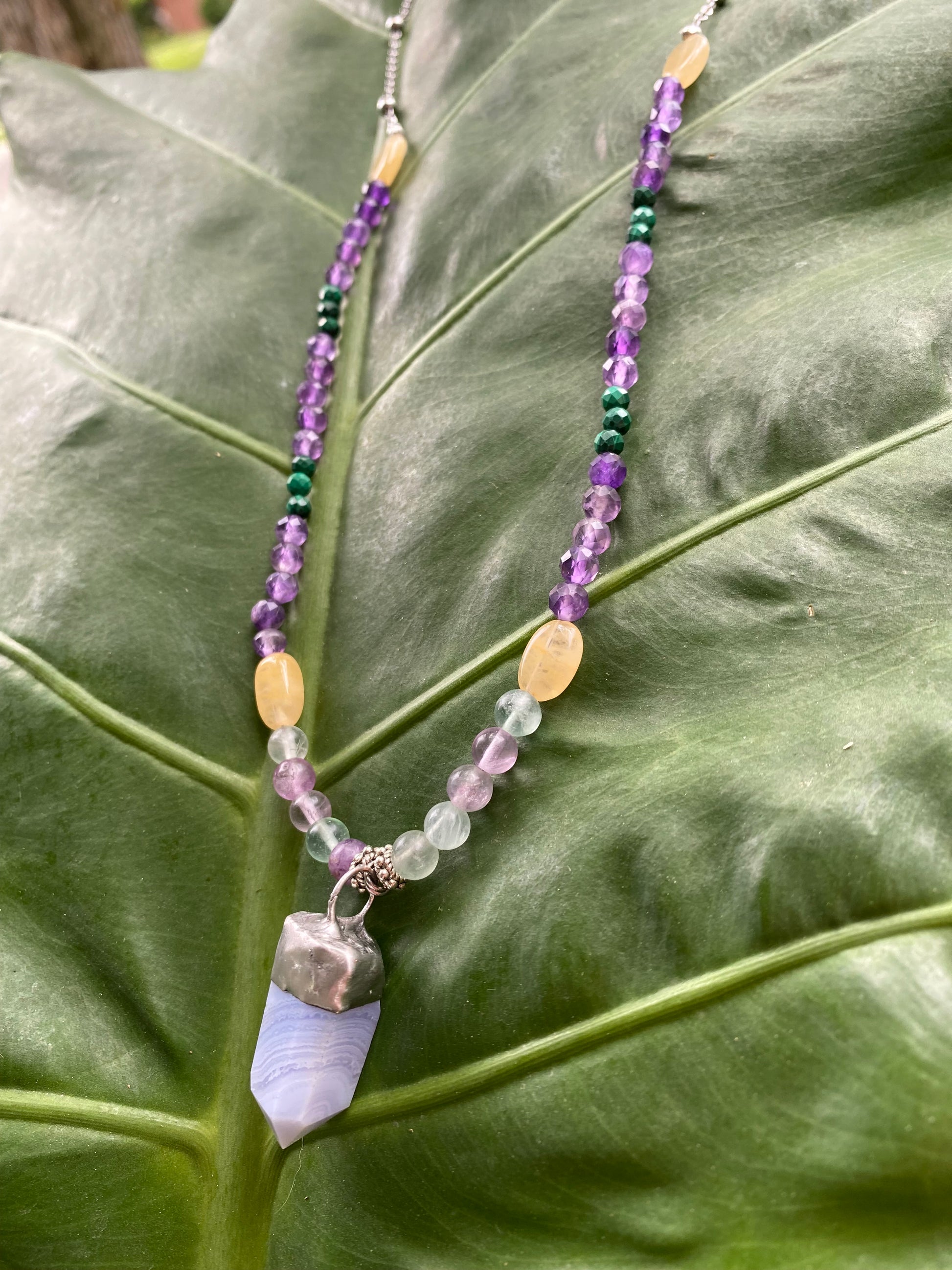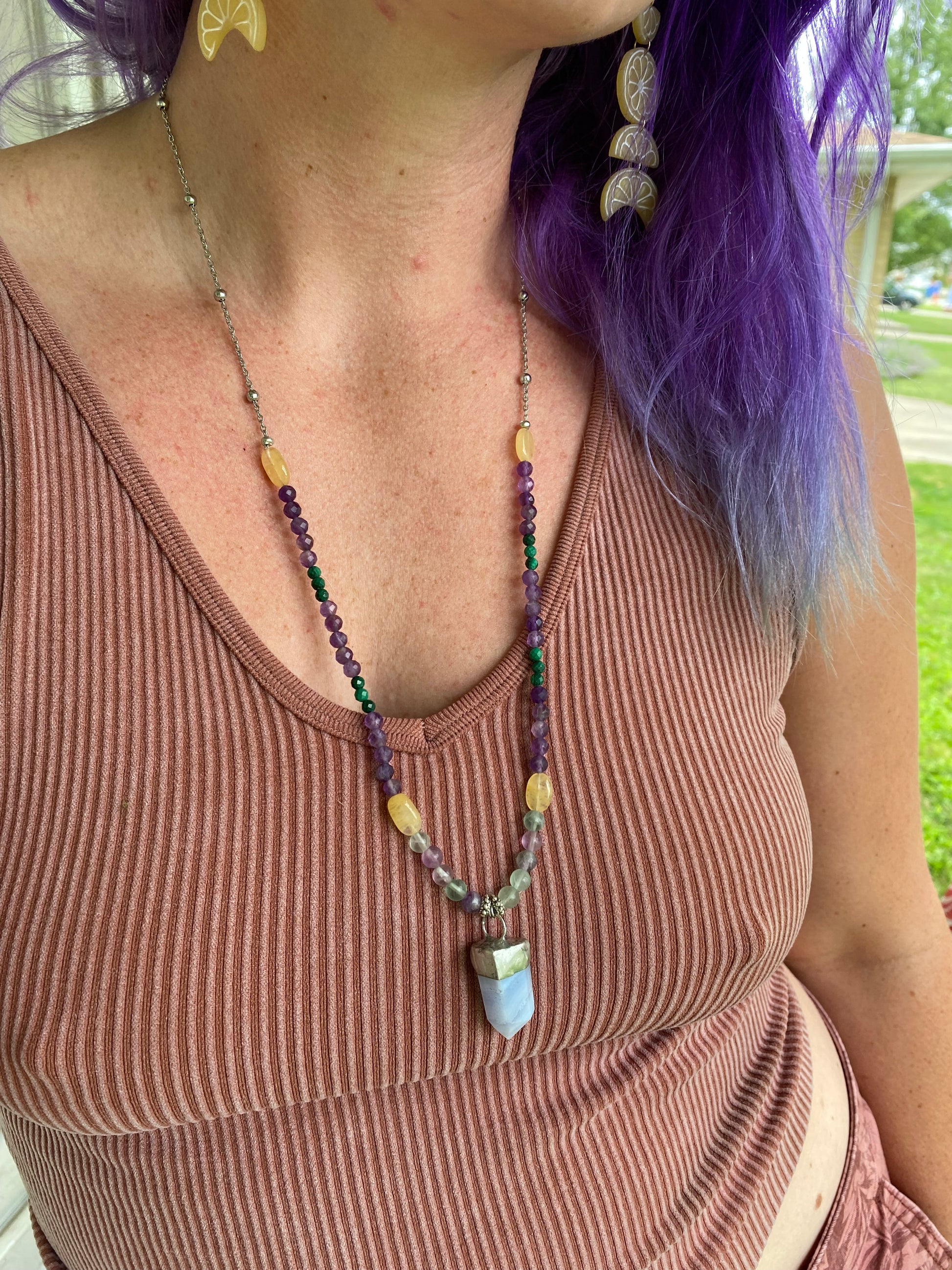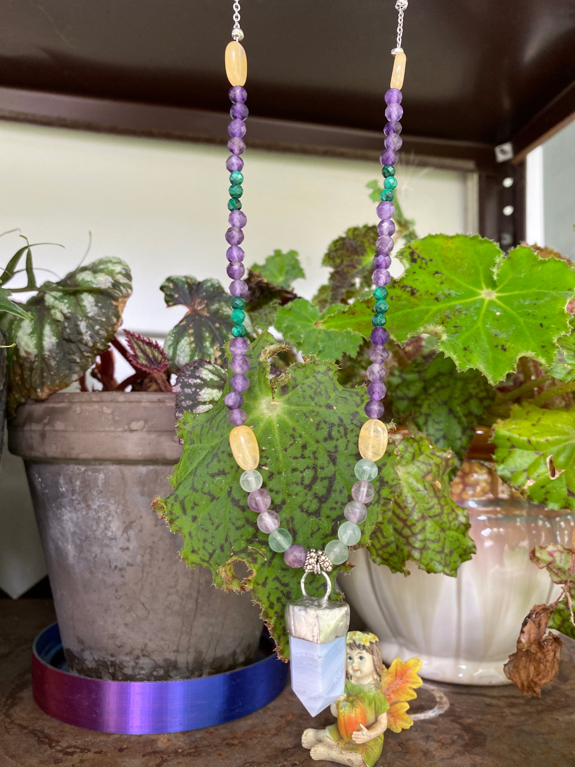 Stone Type: beads: Amethyst, golden healer, malachite, rainbow fluorite